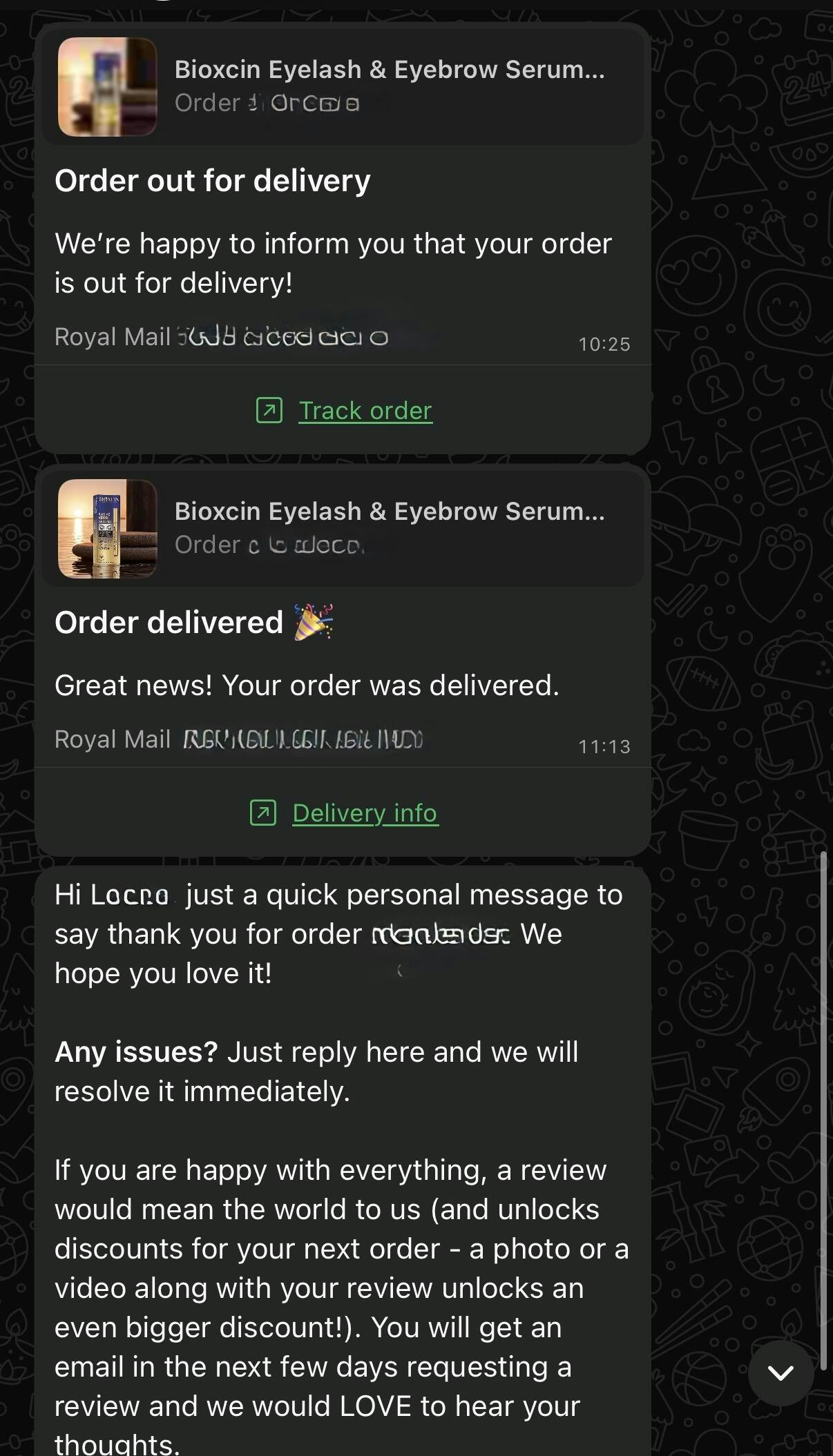 We put a lot of effort into our personal WhatsApp updates to make sure you never have to worry about your delivery, so seeing your screenshot and knowing you appreciated that really means the world to us. Thank you for the high recommendation!